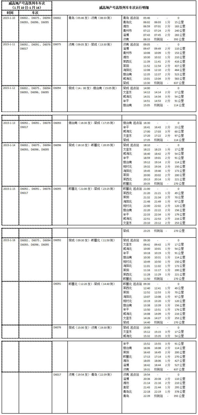 由威高地产集团冠名的“威高地产号”青烟威荣城际列车已在2014年12月31日正式开始运行!通过同济南铁路局的多方沟通与协调,我们将“威高地产号”列车2015年1月10日-1月16日列车车次运行表进行了整理,请分享给周边的亲朋好友!