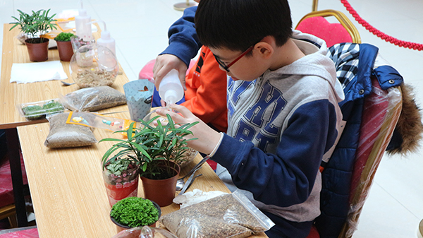 为我们的“大家”添了绿色之后,也要为自己的“小家”添抹绿。在小憩和用餐之后,下午,大家再次齐聚时光城,进行微景观DIY的制作活动。
