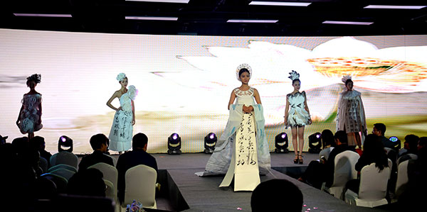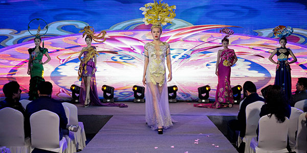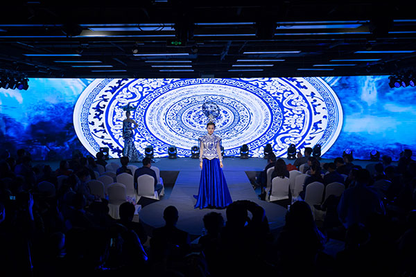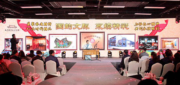 中篇首先是中国风服装秀,青花瓷旗袍展示、融合了书法和水墨山水的宣纸创意时装展示、中国传统元素风情时装展示,给现场带来极具冲击力的视觉感受。随后是威高地产副总经理江学文解读七彩城规划及云山郡项目、威高地产与威海非遗保护中心启动民俗邨非遗基地构建启动授牌、授匾仪式,纸斗技艺传承人张延茹女士向非遗创新实践基地捐献大型作品《水浒群英谱——108将》等。