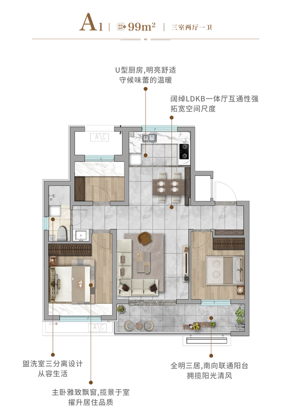 三开间朝南,全明设计,基本每个空间都有开窗,经典“十”字结构,约40平LDKB一体厅,精心考量餐客厅的无障碍互动性,安放年轻人的生活理想。