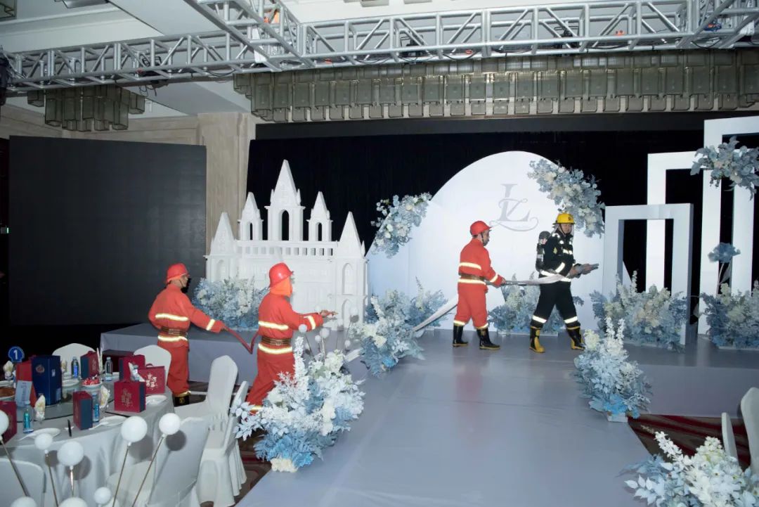 本次消防演练以酒店婚宴和会议场所突发“火情”警报为序幕,员工扮演被困的客人,酒店安全部员工全员待命。一旦火情警报发出,消防中心立即通过对讲机通知火情处置组对现场火势进行控制,同时疏散指挥组负责引导客人就近从安全通道疏散,保证疏散秩序井然有序。