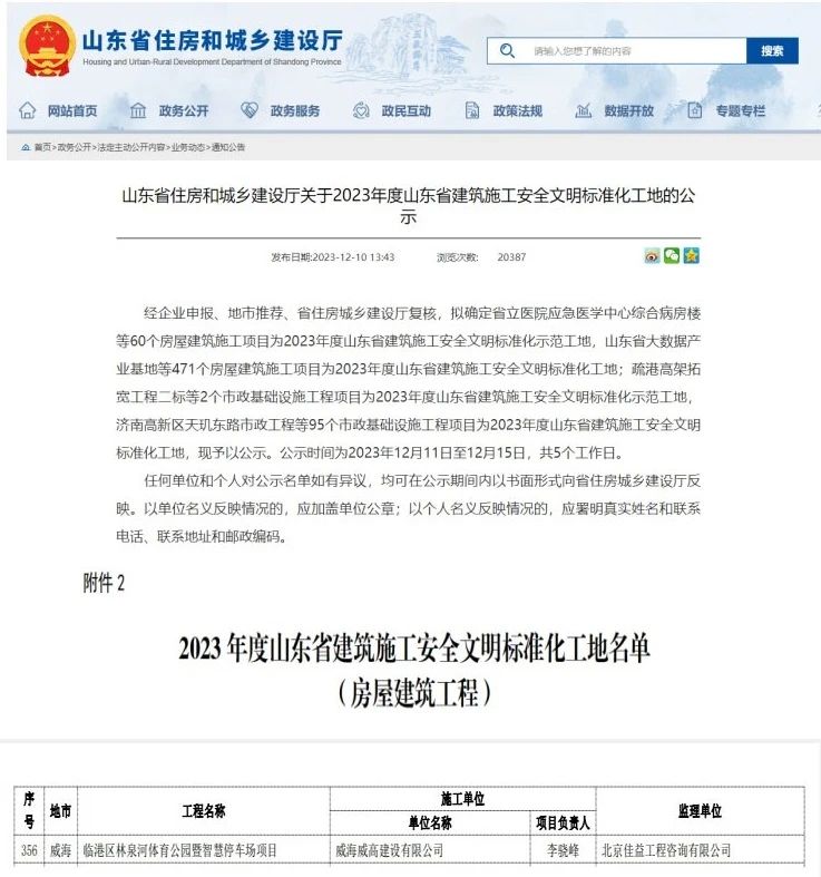 近日,山东省住房和城乡建设厅发布2023年度山东省建筑施工安全文明标准化工地名单》,由建设公司承建的临港区林泉河体育公园暨智慧停车场项目荣获“2023年度山东省建筑施工安全文明标准化工地”称号。