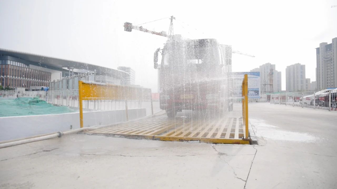 三、严格执行扬尘管控措施。在工地出入口处设置自动洗车设备,确保车辆不带泥出工地,配备洒水车每隔半小时全场洒水降尘,对场区内裸露的地面采用石子和防尘网进行覆盖,现场配备降尘雾炮,并配有专职人员定期管理,做到减少扬尘,美化环境。