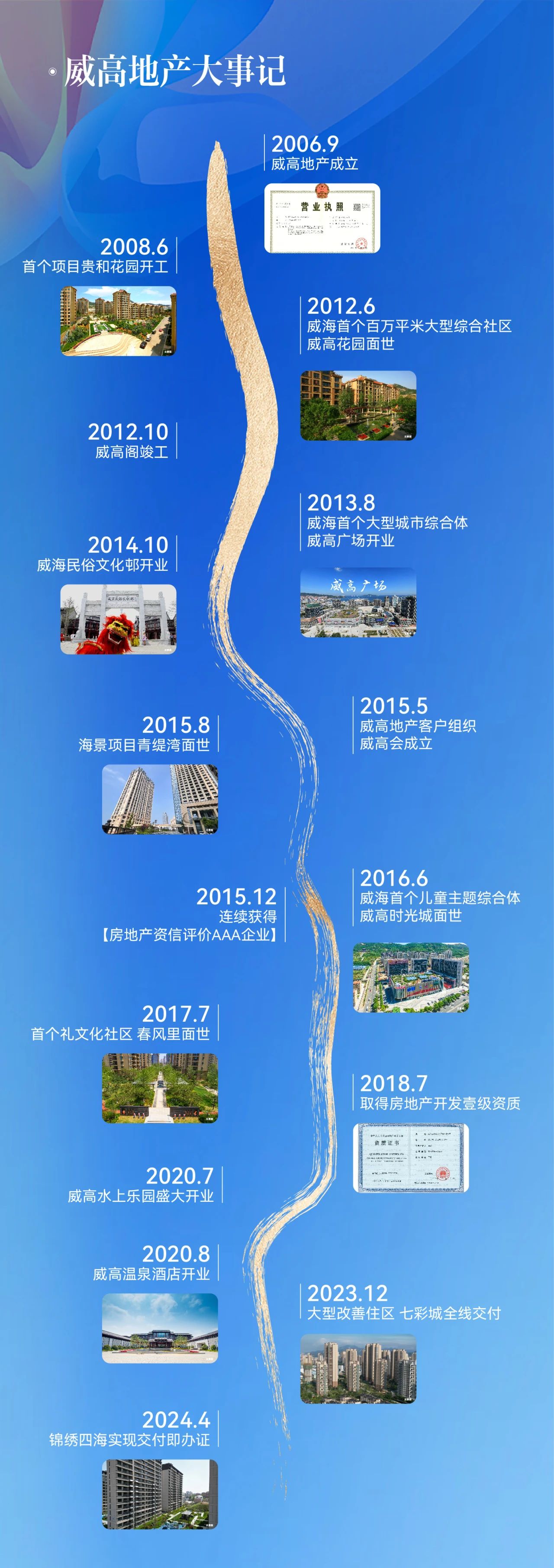 2006-2024,威高地产迎来第18周年。一路走来,威高地产持续聚合城市与集团资源,赋能城市发展建设,开发19盘,建设7座城市地标,将远见与美好融入城市格局。