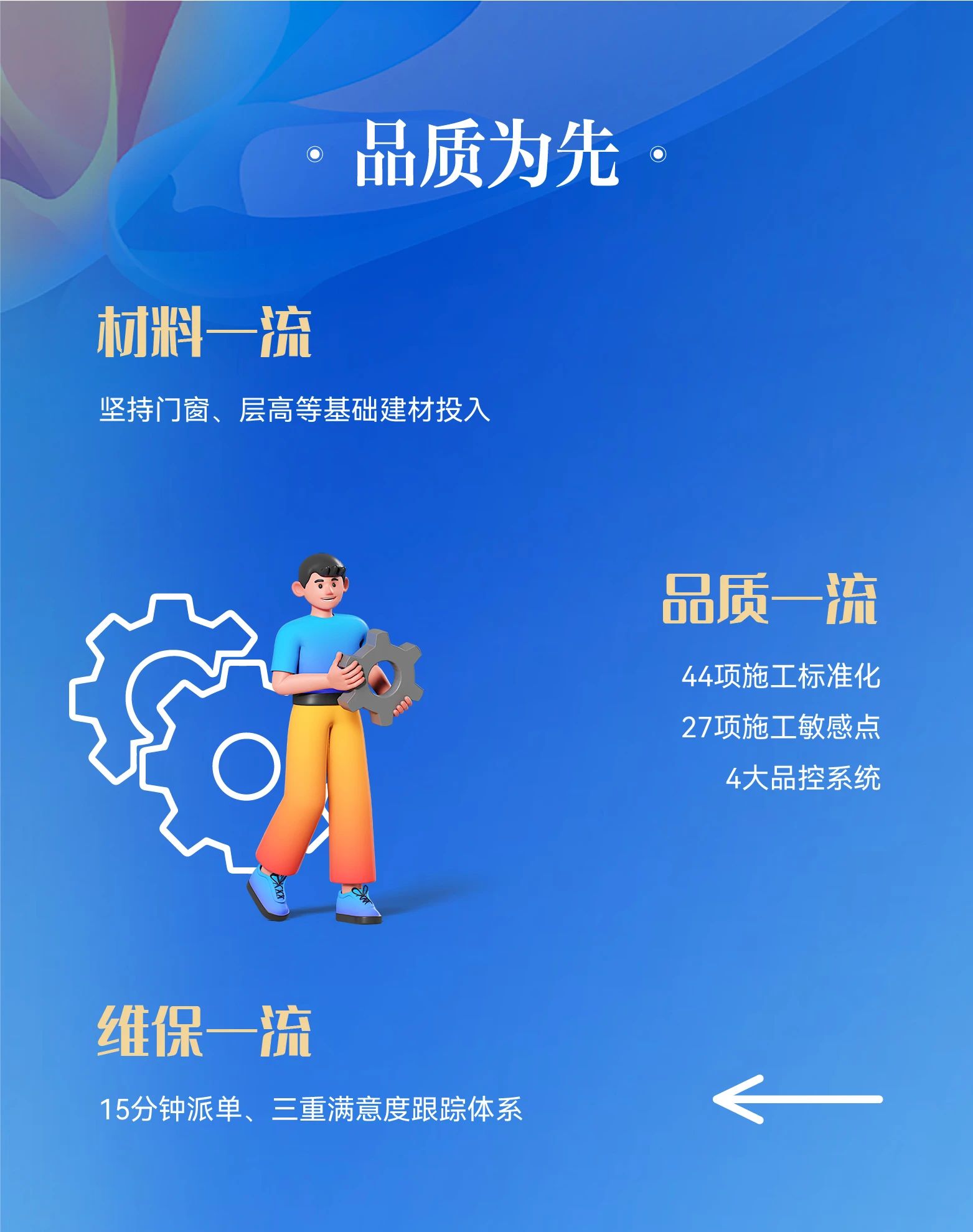 历经18年打磨,工程体系沉淀44项施工标准化、27项施工敏感点标准化;品控体系则通过实测实量、三级巡查、联合验收、一房四验保障了交付品质;维保体系硬控15分钟派单、三重满意度跟踪体系,不断提升业主的居住体验。我们对品质的追求贯穿于房屋的全生命周期。